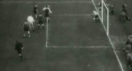 Tottenham Hotspur’s Jimmy Dimmock scores the only goal against Wolverhampton Wanderers at Stamford Bridge in the 1921 F.A. Cup Final, filmed by the Topical Budget newsreel as Cup Final 1921 Greatest Event in Football History